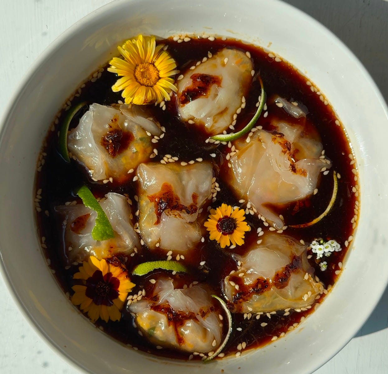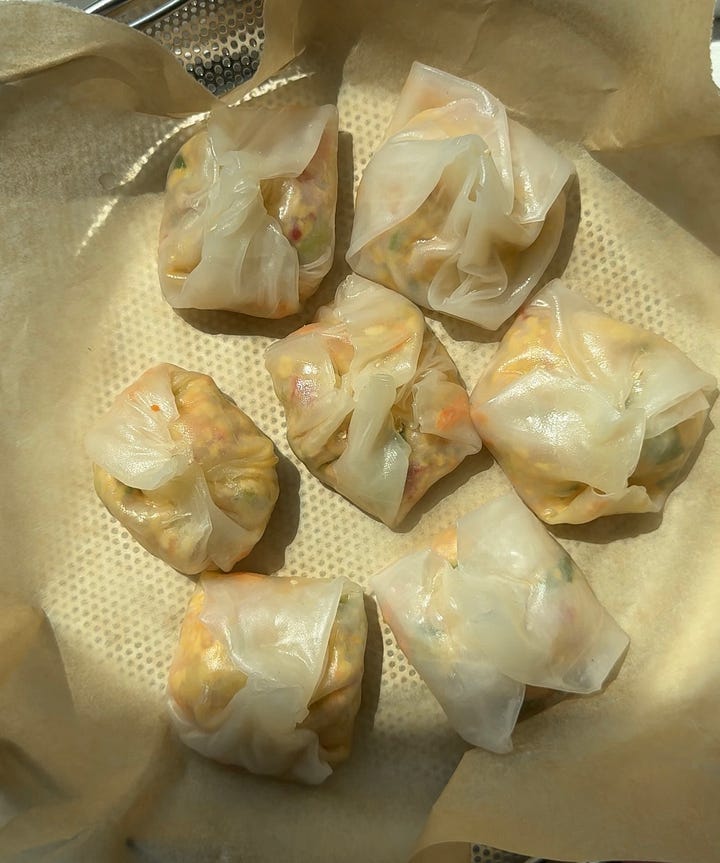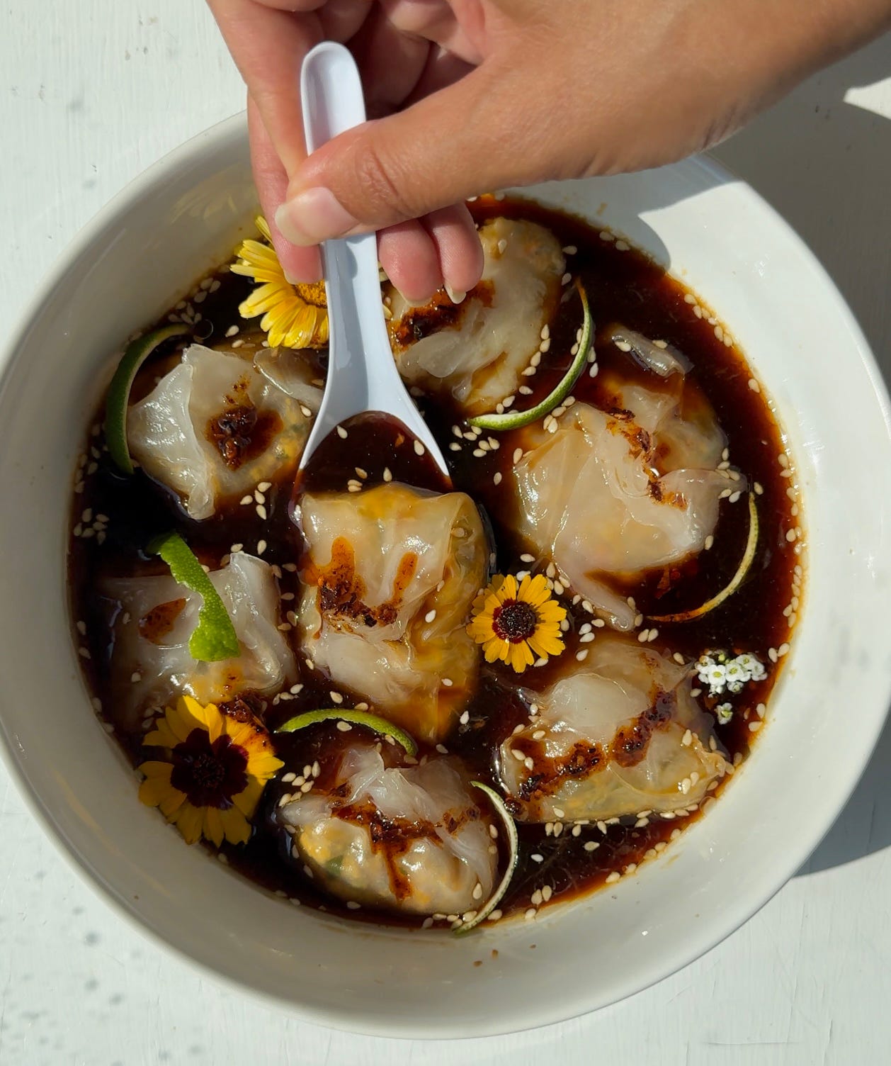Delicate rice paper dumplings filled with grated tofu, crunchy veggies, and bright lime—steamed until glossy and served sitting pretty in a citrus-soy bath. Refreshing, slightly chewy, and ovulatory-phase perfection.