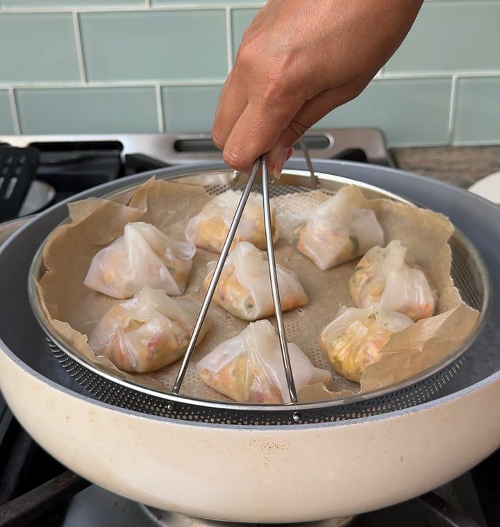 Steam them: Line a steamer basket with parchment paper (poke holes with a fork) or use cabbage/lettuce leaves. Add your dumplings, making sure there is some space between them (you’ll need to do batches). Bring 1–2 inches of water to a boil in a wide pot or pan with a lid. Add your dumplings and steam for 9–10 minutes. Let sit for 1–2 minutes before handling. Tip: Wrap the pot lid in a thin kitchen towel to absorb excess condensation and secure with a rubber band or tie at the top.