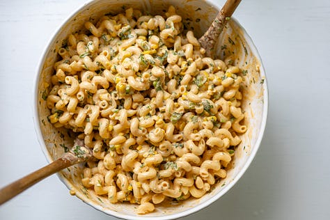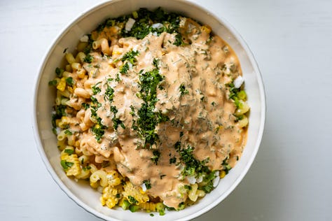 It’s a spicy, elote-inspired pasta salad so what is not to love. The dressing kind of tastes like the Chipotle salad dressing (iykyk) and I’d like to drown in it. There’s a lot of our favorite things in here like jalapeños, scallions, and cilantro (top tier herb). Then, we top it off with tajin - it’s giving SPICY MARG. If you like tajin on the rim, you’ll love it on a noodle (??)