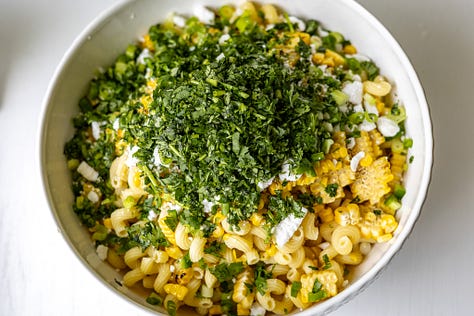 Combine: In a large bowl, combine the pasta, corn kernels, jalapeños, scallions, cilantro, feta or cojita cheese, and the dressing. If you are not serving right away, reserve some of the dressing for when it’s time (otherwise the pasta will soak it up).